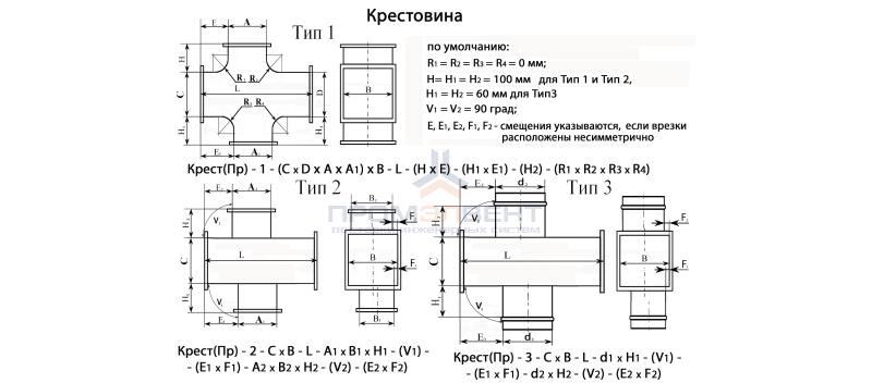 Крестовина представляет собой прямой участок воздуховода и врезанные в него врезки, количество врезок и сечение может быть различным. Крестовина прямоугольного сечения может быть с прямоугольными врезками, с круглыми или в комбинации с прямоугольными и круглыми врезками. Врезки в крестовине могут быть расположены под различным углом.